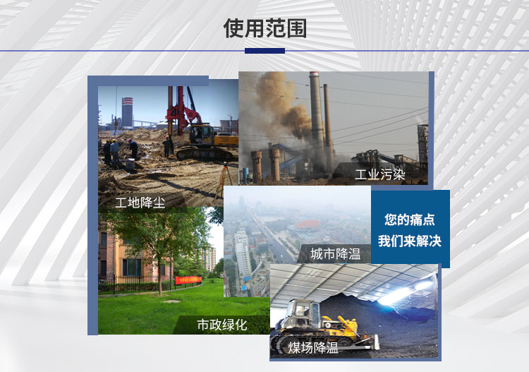 除塵范圍:粉塵治理、露天物料堆場(chǎng)、煤炭物流園區(qū)、露天礦山開采、露天爆破粉塵、封閉卸料區(qū)、卡車卸料口、自卸車卸料粉塵、大型裝載車工作粉塵、沿海港口裝運(yùn)、轉(zhuǎn)運(yùn)煤炭、礦石、散裝粉料搬運(yùn)等粉塵污染治理;保濕降溫:飛機(jī)場(chǎng)、高速公路、車站、碼頭、公共場(chǎng)所、運(yùn)動(dòng)場(chǎng)地、炎熱場(chǎng)地等大范圍降塵保濕降溫消毒;噴藥病害防治:垃圾填埋場(chǎng)、衛(wèi)生防疫、城市園林綠化以及自然災(zāi)害過(guò)后大面積的殺菌、消毒、除臭、防疫防治病蟲害等。