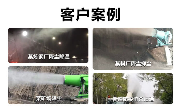 除塵范圍:粉塵治理、露天物料堆場、煤炭物流園區(qū)、露天礦山開采、露天爆破粉塵、封閉卸料區(qū)、卡車卸料口、自卸車卸料粉塵、大型裝載車工作粉塵、沿海港口裝運(yùn)、轉(zhuǎn)運(yùn)煤炭、礦石、散裝粉料搬運(yùn)等粉塵污染治理;保濕降溫:飛機(jī)場、高速公路、車站、碼頭、公共場所、運(yùn)動場地、炎熱場地等大范圍降塵保濕降溫消毒;噴藥病害防治:垃圾填埋場、衛(wèi)生防疫、城市園林綠化以及自然災(zāi)害過后大面積的殺菌、消毒、除臭、防疫防治病蟲害等。
