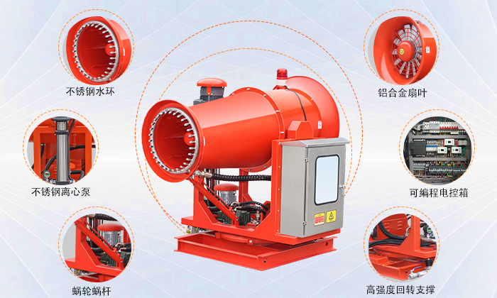 | 型號 | 靜風(fēng)射程 (m) | 風(fēng)機(jī)功率(Kw) | 水泵功率 (Kw) | 總功率(Kw) | 俯仰角度 (常規(guī)) | 旋轉(zhuǎn)角度 | 噴頭數(shù)量 | 20米處噪音 (dB) | 箱體重量 (kg) | ||