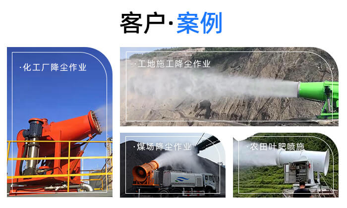 除塵范圍:粉塵治理、露天物料堆場(chǎng)、煤炭物流園區(qū)、露天礦山開(kāi)采、露天爆破粉塵、封閉卸料區(qū)、卡車卸料口、自卸車卸料粉塵、大型裝載車工作粉塵、沿海港口裝運(yùn)、轉(zhuǎn)運(yùn)煤炭、礦石、散裝粉料搬運(yùn)等粉塵污染治理;保濕降溫:飛機(jī)場(chǎng)、高速公路、車站、碼頭、公共場(chǎng)所、運(yùn)動(dòng)場(chǎng)地、炎熱場(chǎng)地等大范圍降塵保濕降溫消毒;噴藥病害防治:垃圾填埋場(chǎng)、衛(wèi)生防疫、城市園林綠化以及自然災(zāi)害過(guò)后大面積的殺菌、消毒、除臭、防疫防治病蟲(chóng)害等。
