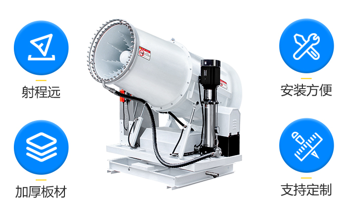 | 型號 | 靜風(fēng)射程 (m) | 風(fēng)機功率(Kw) | 水泵功率 (Kw) | 總功率(Kw) | 俯仰角度 (常規(guī)) | 旋轉(zhuǎn)角度 | 噴頭數(shù)量 | 20米處噪音 (dB) | 箱體重量 (kg) | ||