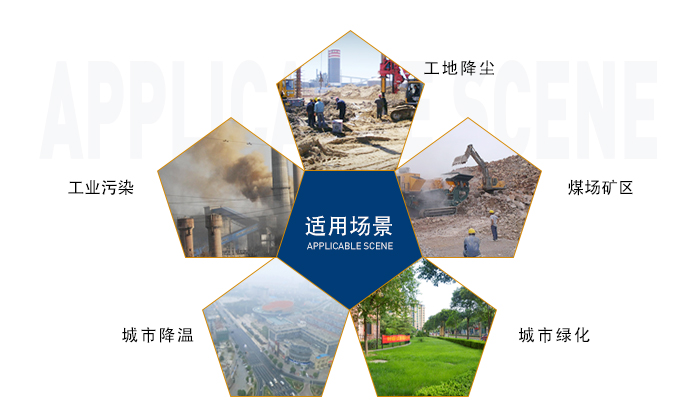 揚塵污染治理:適用于對煤礦行業(yè)、化工行業(yè)、發(fā)電行業(yè)、建筑拆遷、工地施工等容易產生揚塵污染的場所進行抑塵、降塵治理;
