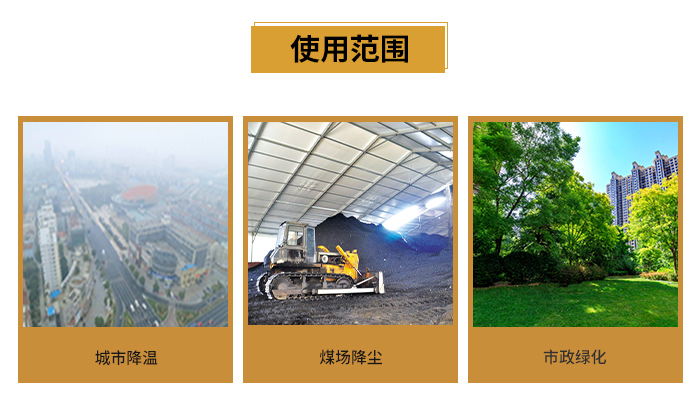 除塵范圍:粉塵治理、露天物料堆場(chǎng)、煤炭物流園區(qū)、露天礦山開采、露天爆破粉塵、封閉卸料區(qū)、卡車卸料口、自卸車卸料粉塵、大型裝載車工作粉塵、沿海港口裝運(yùn)、轉(zhuǎn)運(yùn)煤炭、礦石、散裝粉料搬運(yùn)等粉塵污染治理;保濕降溫:飛機(jī)場(chǎng)、高速公路、車站、碼頭、公共場(chǎng)所、運(yùn)動(dòng)場(chǎng)地、炎熱場(chǎng)地等大范圍降塵保濕降溫消毒;噴藥病害防治:垃圾填埋場(chǎng)、衛(wèi)生防疫、城市園林綠化以及自然災(zāi)害過(guò)后大面積的殺菌、消毒、除臭、防疫防治病蟲害等。